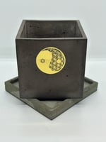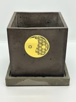 3”x3” square cement pot with mismatched drip plate. Hole for drainage and soft pads to protect furniture. Gold emblem.