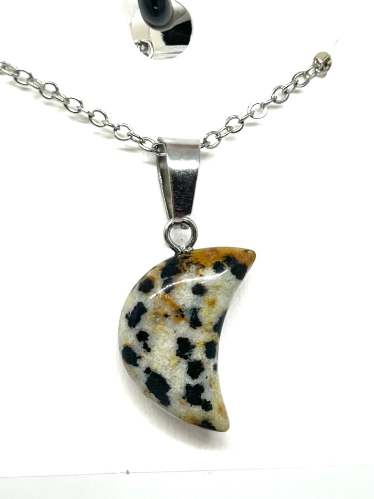 Dalmatian Jasper crescent moon pendant with 18” chain.
