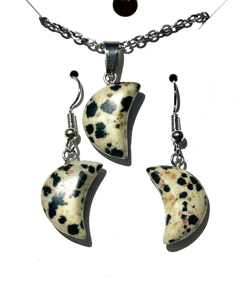 Dalmatian Jasper crescent moon pendant with 18" chain and classic hanging earring set.