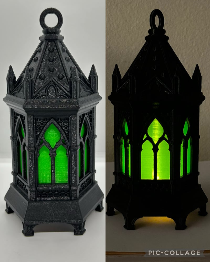 Little black 3D printed lantern with battery operated flickering tea light. Emerald green "windows" give off a glow that reminds me of the movie Wizard of Oz and more recently the movie Wicked. These make great nightlights or can be a wonderful addition to anyone's every day decor.