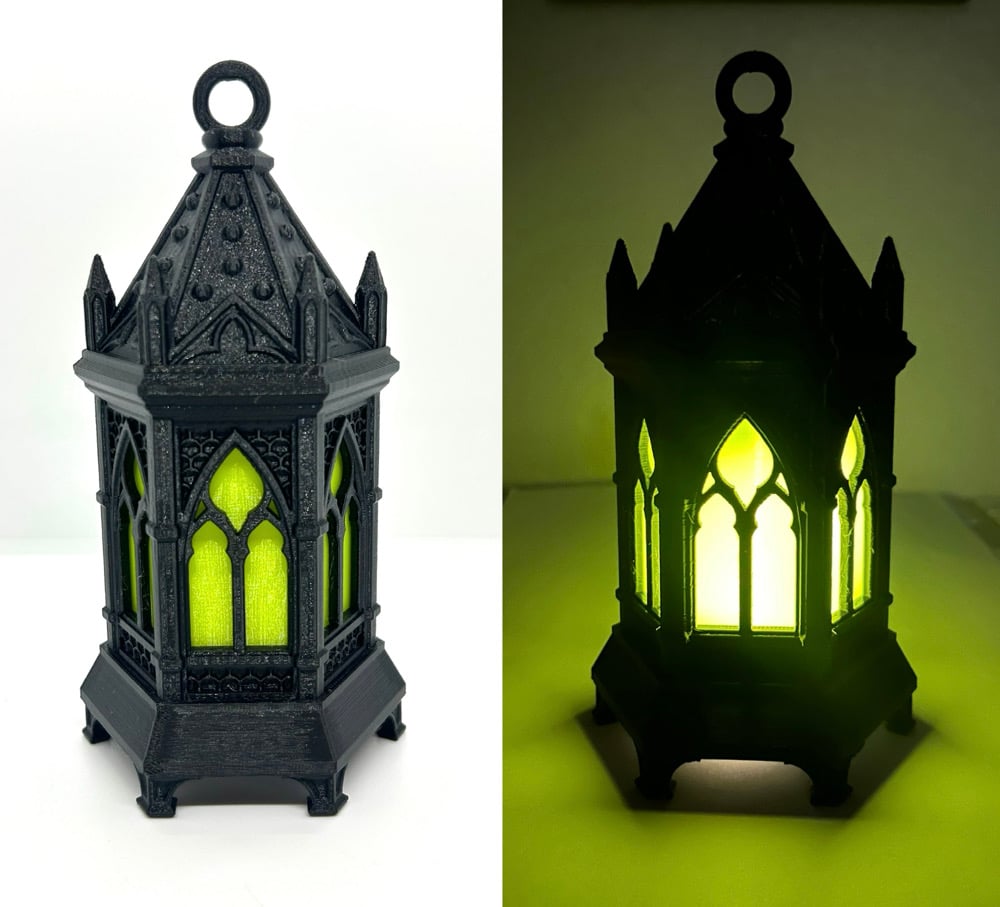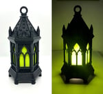 Little black 3D printed lantern with battery operated flickering tea light. Green "windows" give off a brighter type glow. These make great nightlights or can be a great addition to anyones Halloween decor.