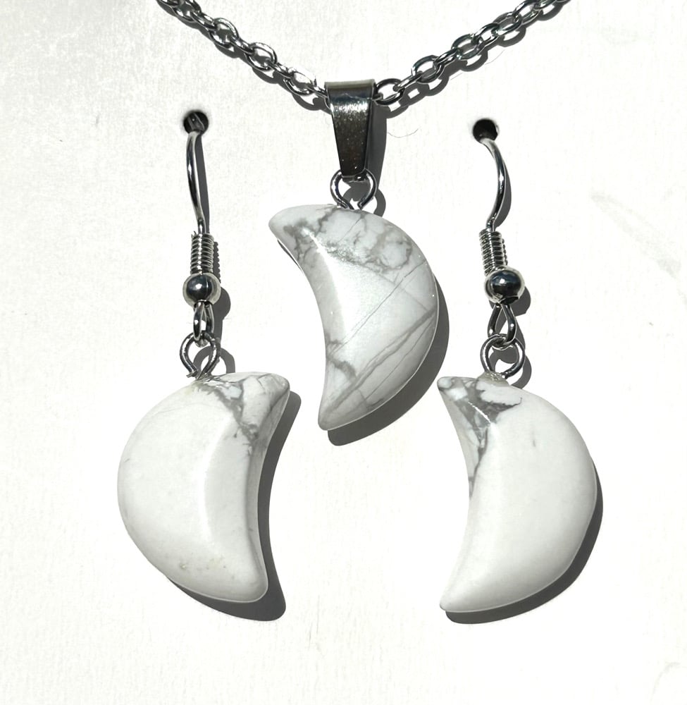Howlite crescent moon pendant with 18" chain and classic hanging earrings set.