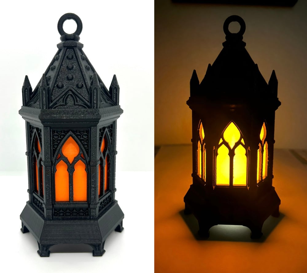 Little black 3D printed lantern with battery operated flickering tea light. Orange "windows" give off a warm, candle glow. These make great nightlights or an awesome Halloween type effect.