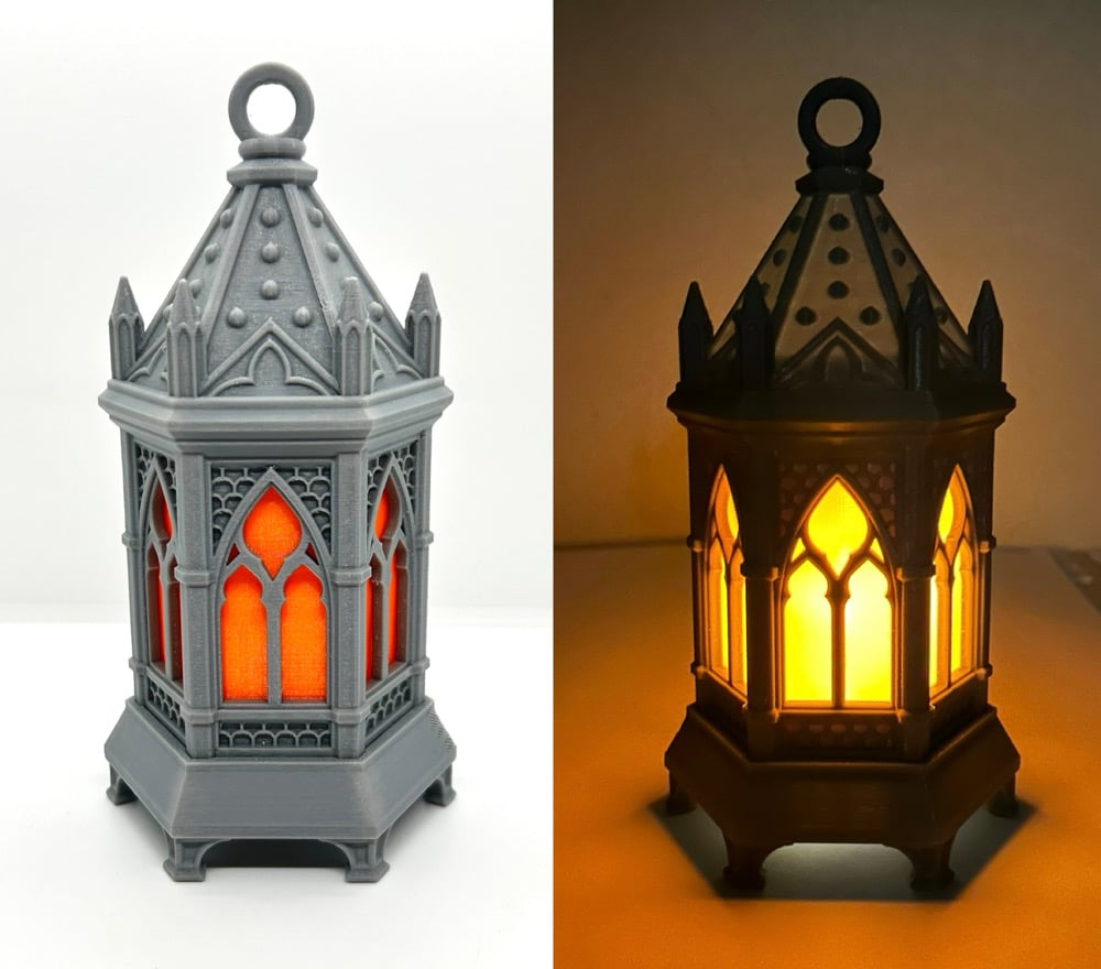 Little dark grey 3D printed lantern with battery operated flickering tea light. Orange "windows" give off a deeper, warm candle glow. These make great nightlights or can be a wonderful addition to anyone's every day decor.