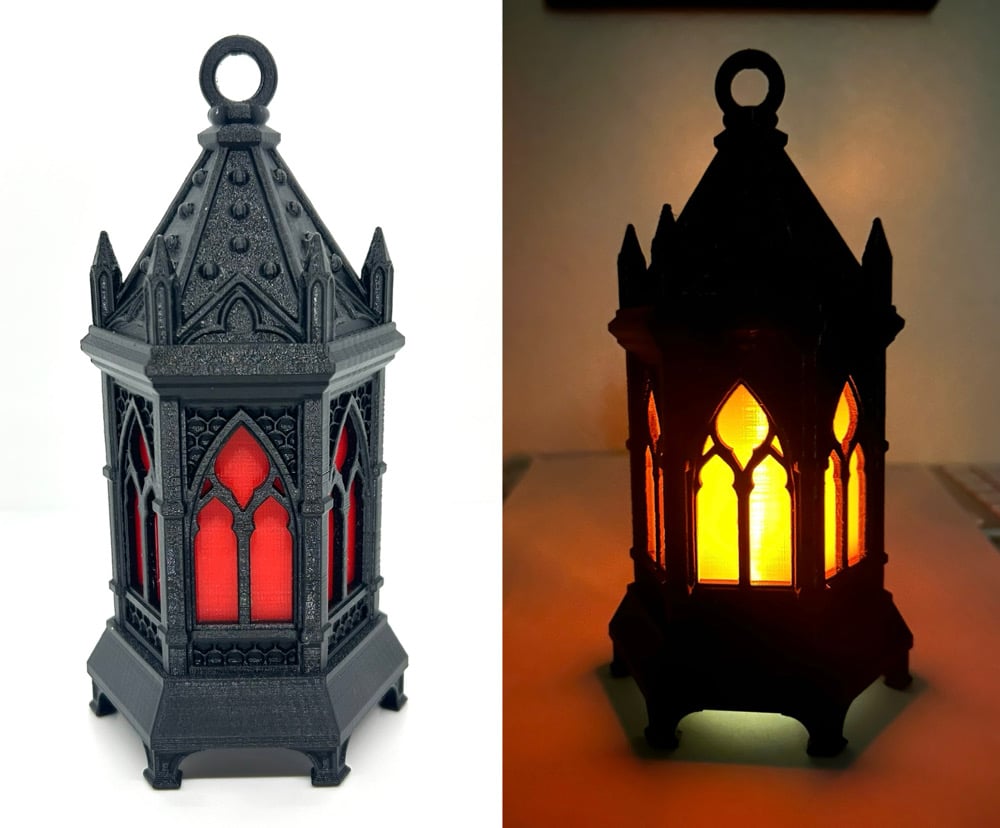 Little black 3D printed lantern with battery operated flickering tea light. Red "windows" give off a deeper warm, candle glow. These make great nightlights or a wonderful edition to Halloween decor...maybe a gift for your favorite gothic person?