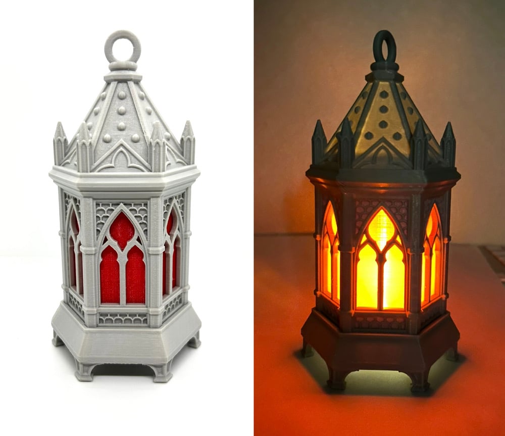 Little light grey 3D printed lantern with battery operated flickering tea light. Red "windows" give off a deeper, warmer candle type glow. These make great nightlights or can be a wonderful addition to anyone's every day decor.