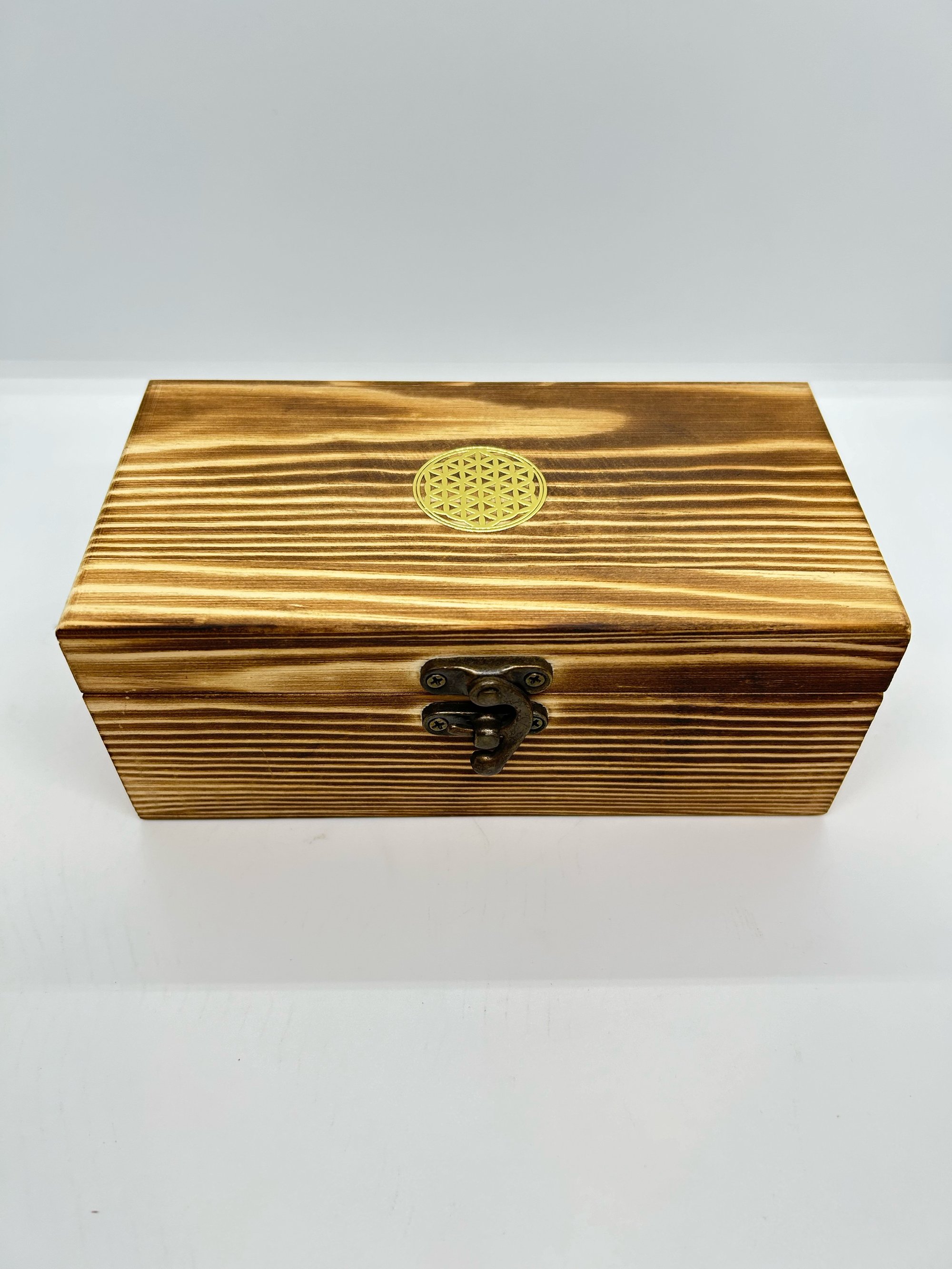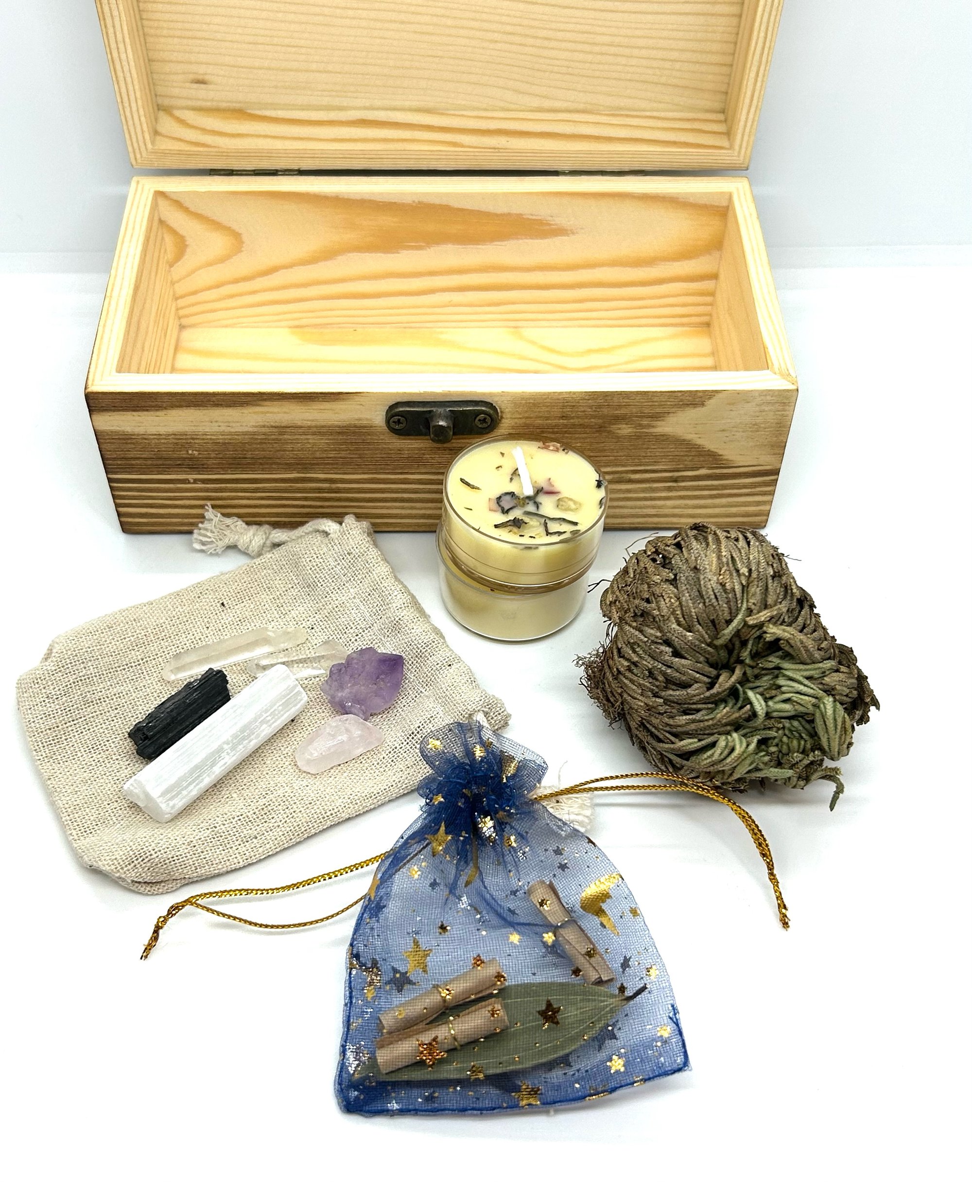 This is our small intention setting kit which comes with one Rose of Jericho, one palo santo stick, two candles, bag of crystals, bag of scrolls & bay leaf and a box to hold it all.